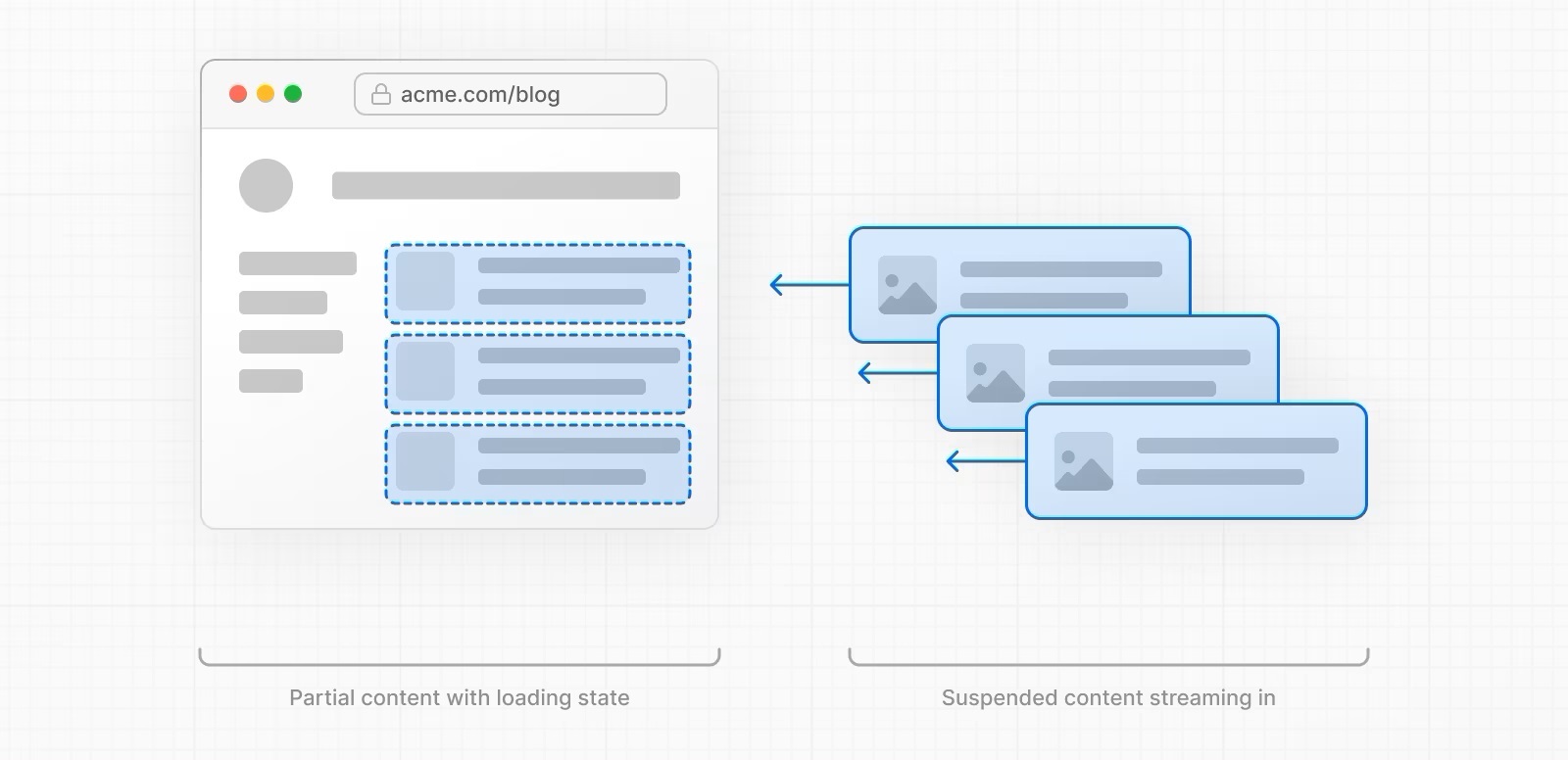 Streaming with <Suspense> progressively renders HTML from the server to the client and prioritizes what components to hydrate and make interactive first based on user interaction.